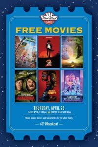 Families can arrive early for music, bounce houses, and kid-friendly activities before showtime. Grab snacks like $2 nachos from the concession stand and relax with a blanket or lawn chair for a fun outdoor movie experience.