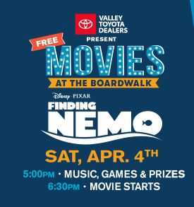 Experience “Movies at the Boardwalk,” a free family event with music, games, and tons of prizes beginning at 5:00 p.m. The movie “Finding Nemo” will begin at dusk. Come early to claim a spot, as space will be on a first-come, first-serve basis. It is recommended to bring folding chairs and/or blankets. No Admission or Activity Fees Required.